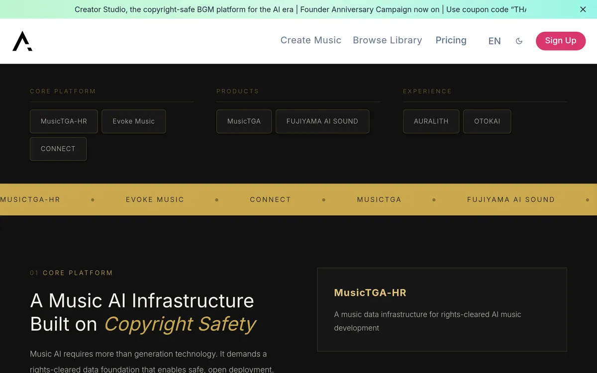 Amadeus Code offers a comprehensive platform designed to enable the creation and use of AI-generated music while ensuring copyright safety. Their infrastructure supports the entire workflow, from rights-cleared data and audio supply to royalty processing, allowing for transparent and commercial use of AI music. The platform features tools like MusicTGA, a music creation app, and FUJIYAMA AI SOUND, which generates unique audio assets. Additionally, they provide services such as Evoke Music for copyright-free music licensing, CONNECT for rights management, and experiences like AURALITH and OTOKAI that emphasize the connection between music, brand value, and community well-being.