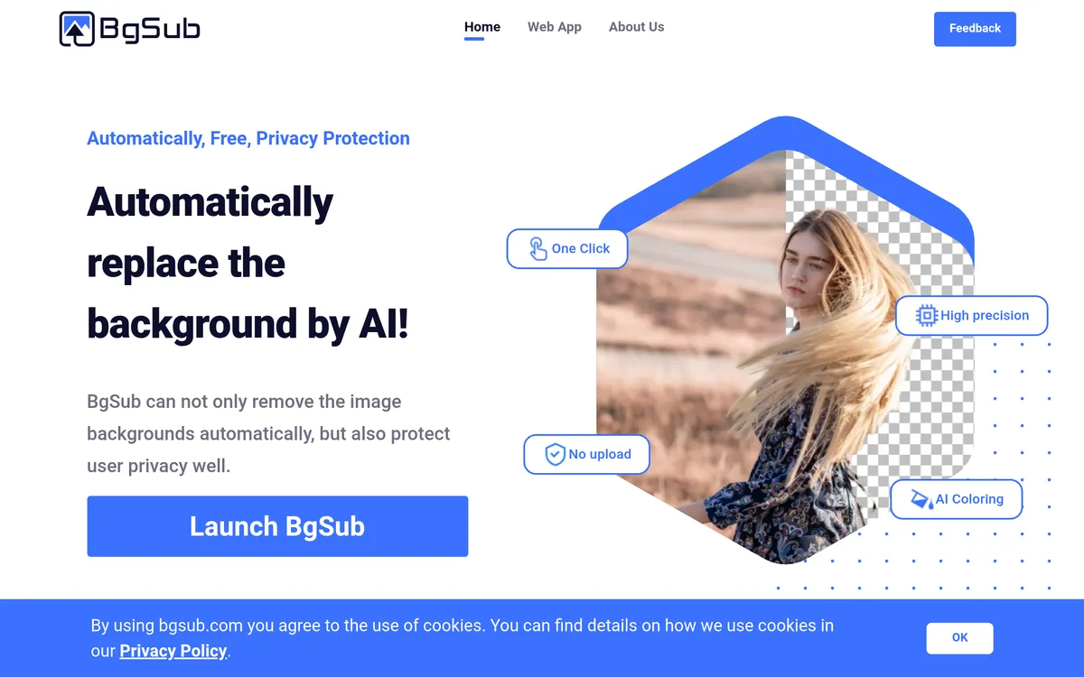 BgSub automatically removes and replaces image backgrounds using AI technology.