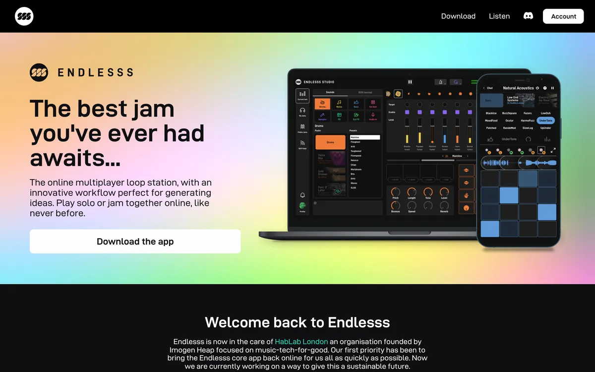 Endlesss is an innovative platform for music creation that allows users to play solo or jam together online. It functions as a multiplayer loop station, helping users generate musical ideas in an interactive way. The platform is now under the care of HabLab London, an organization founded by Imogen Heap, focusing on leveraging music technology for positive social impact. Endlesss emphasizes community support and creativity without selling user data or music, ensuring a safe space for artists and musicians to collaborate and share their work.