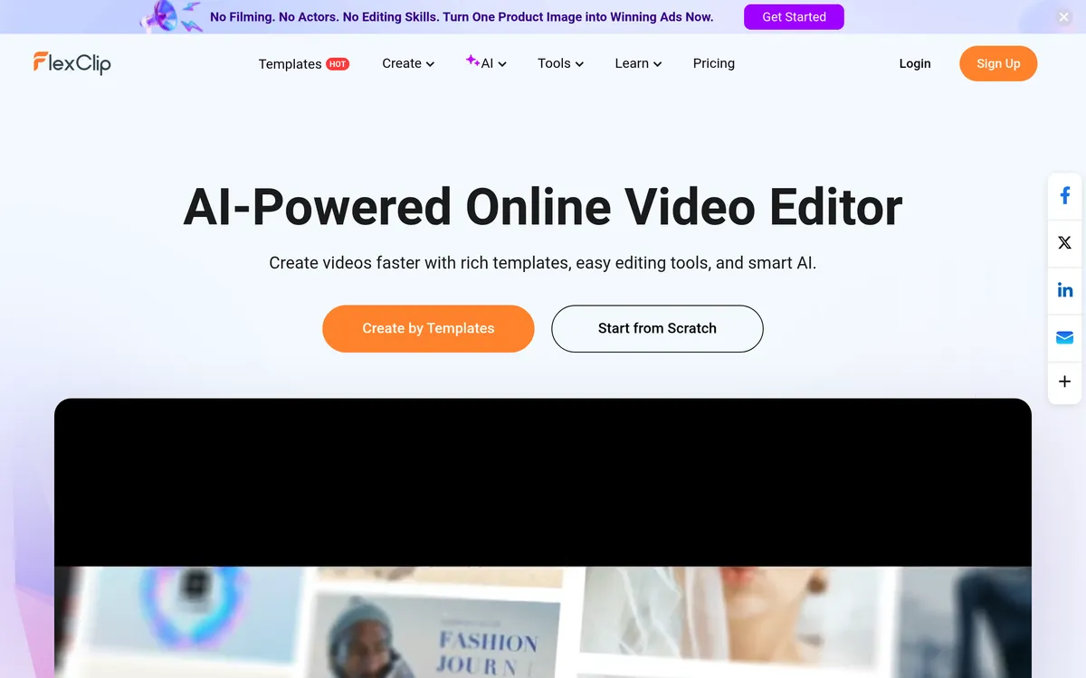 FlexClip helps users create videos faster using templates and editing tools.