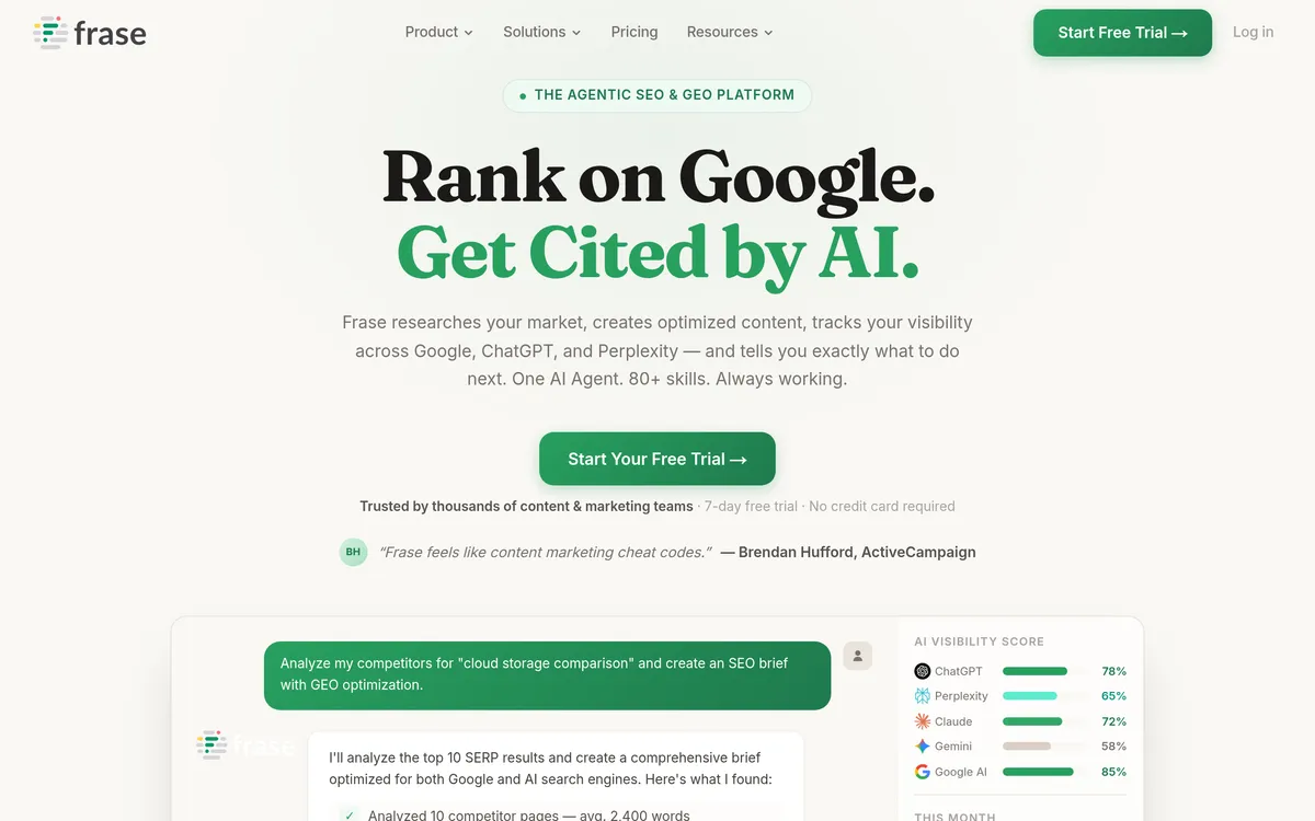 Frase researches and optimizes content while tracking visibility across multiple platforms.