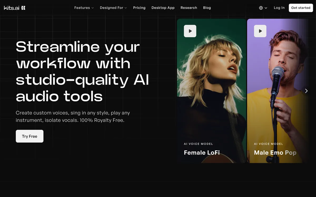 Kits AI provides studio-quality AI music tools for creating custom voices and enhancing audio production.