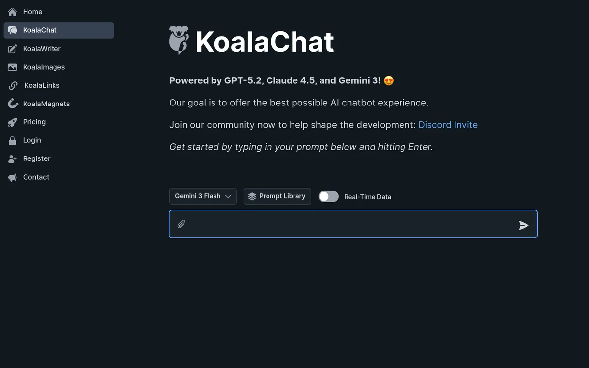 Koala Chat utilizes GPT-5.2, Claude 4.5, and Gemini 3 to provide users with a sophisticated AI chatbot experience. The platform encourages community involvement through a Discord channel where users can help shape development. Users can easily start chatting by entering prompts and getting instant responses. The focus is on creating an intuitive and efficient interaction between users and the AI, ensuring a seamless conversation experience.