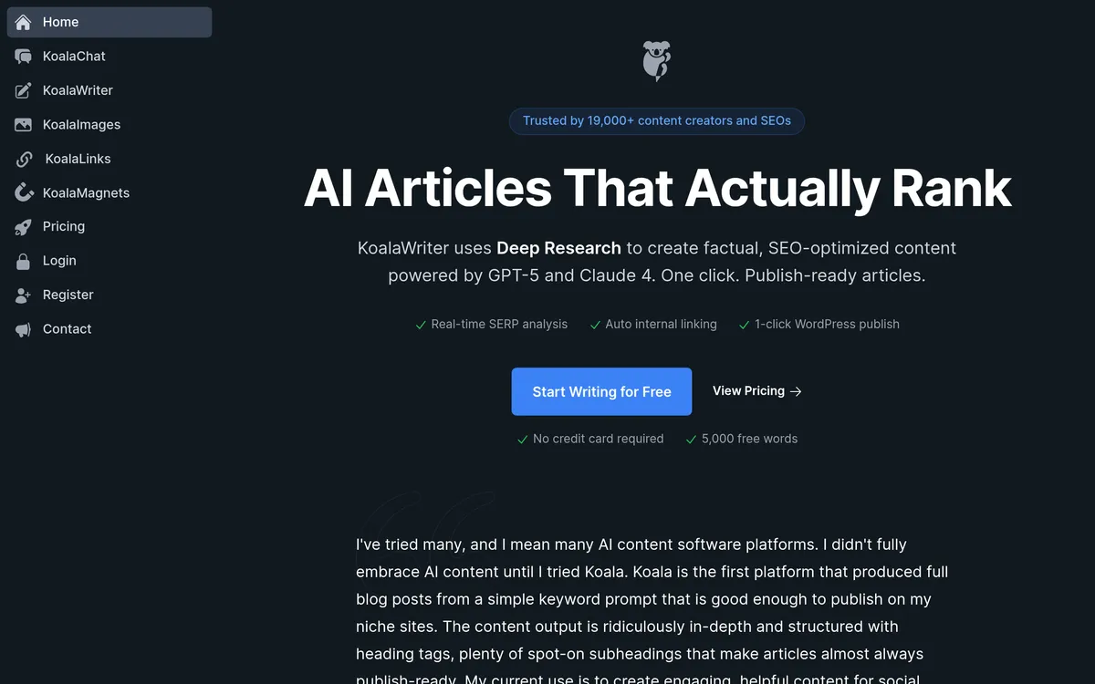 KoalaWriter uses AI to create SEO-optimized content with minimal input.