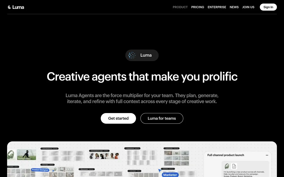 Luma offers creative agents designed to enhance teamwork and productivity in professional creative workflows.