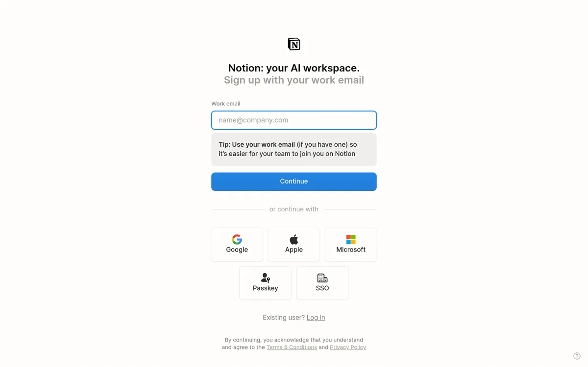 Notion is an all-in-one workspace designed to streamline collaboration among teams. It allows users to create, share, and organize notes, tasks, and projects in a flexible manner. Built for collaboration, it integrates various tools and functionalities, making it suitable for remote work and team management. By signing up with a work email, users can easily collaborate with teammates and manage workflows effectively. The platform supports various sign-in options, including Google, Apple, and Microsoft, enhancing accessibility across different user preferences.