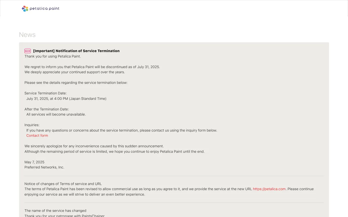 Petalica Paint, formerly PaintsChainer, is a digital painting tool that allows users to create artwork with the help of AI technology. The service has been operational for several years but will be discontinued on July 31, 2025. Users are encouraged to continue using the service until the termination date. The service has undergone several changes in its operation and terms, with the new operator being pixiv Inc. since November 15, 2019. Along with a name change, the platform has recently added new features such as a painting style called "Canna" and a "Sketch Simplification" tool for refining sketches.