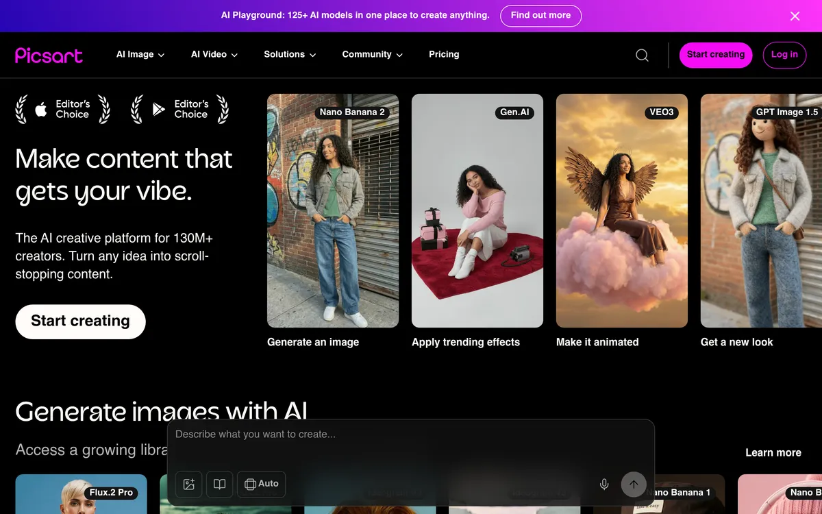 Picsart is an AI creative platform designed for over 130 million creators to transform ideas into visually appealing content. It offers a variety of tools for image and video generation, enabling users to create stunning visuals easily. The platform features more than 30 AI models, allowing users to generate images, apply trending effects, and even animate their creations. With multiple mini-apps, creators can change scenes, swap clothing, or experiment with hairstyles, making it versatile for various creative needs.