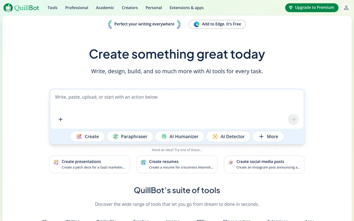 QuillBot is an AI-assisted writing tool that helps users create, refine, and polish their writing. It caters to various tasks like drafting emails, creating presentations, or generating social media posts. With a user-friendly interface, the platform allows seamless brainstorming, research, and design collaboration. The suite of tools includes features for writing, originality checking, image generation, and file conversions. It serves millions of users worldwide, empowering them to enhance their writing processes effectively with minimal effort.
