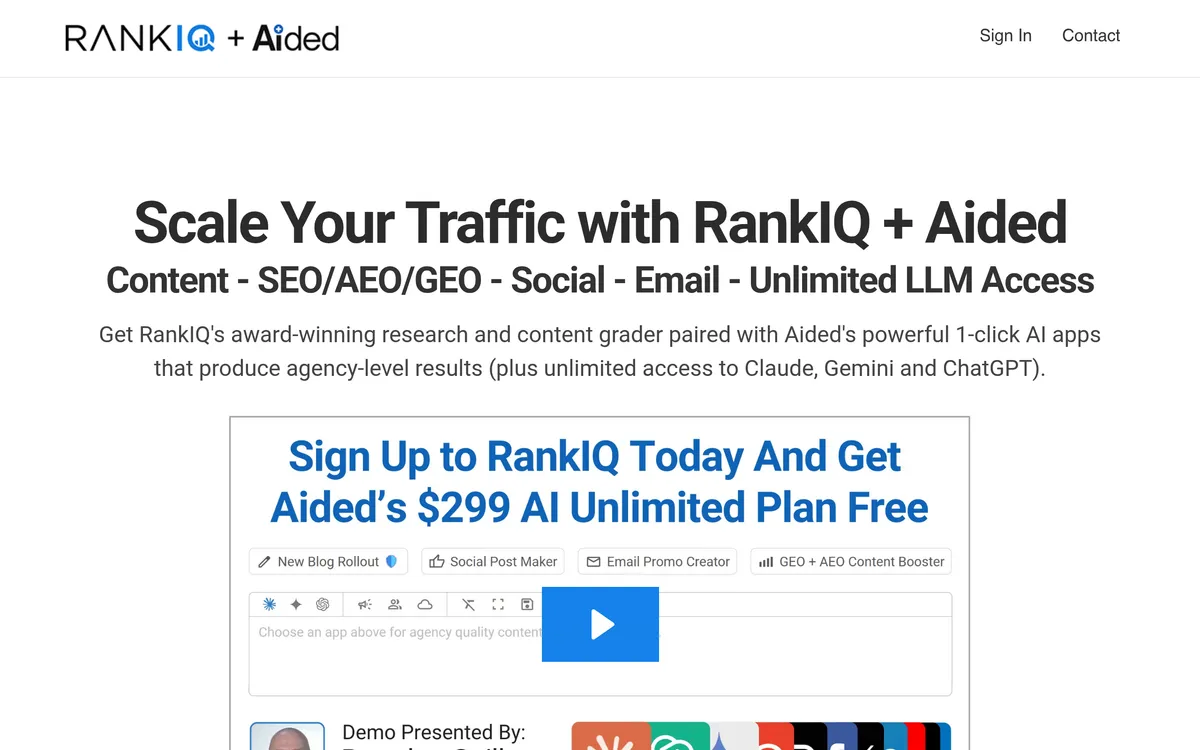 RankIQ is designed for bloggers, providing tools to help them rank their content on the first page of Google. The platform features a content optimizer that assists users in finding low-competition keywords with high traffic potential, enabling the creation of optimized blog posts in less time. Additionally, RankIQ integrates with Aided for social media and email content generation, offering agency-level quality posts on demand. A study of Mediavine blogs showed that users of RankIQ significantly increased their Google traffic compared to those who did not use the service. With a focus on optimizing old posts and comprehensive keyword research, RankIQ simplifies the blogging process while driving traffic and engagement.