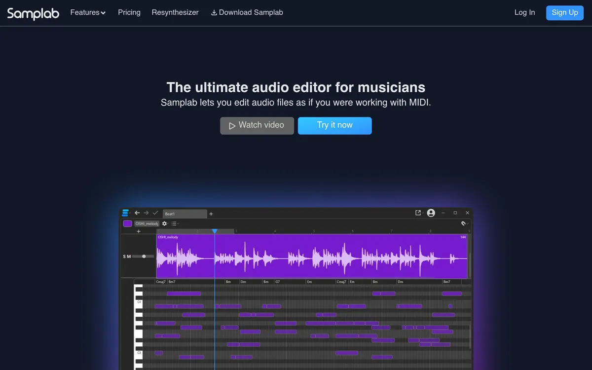 Samplab allows users to change any note in their audio while ensuring the sound remains of high quality. It features capabilities for detecting and editing chords, which can be exported as MIDI files. Producers can also synchronize the tempo and key of samples, adapt chords, melodies, and drums, and separate audio stems for individual modification. Available as a plugin for DAWs or as a desktop application, it integrates smoothly into existing workflows. The platform supports various audio lengths and formats depending on the subscription tier.