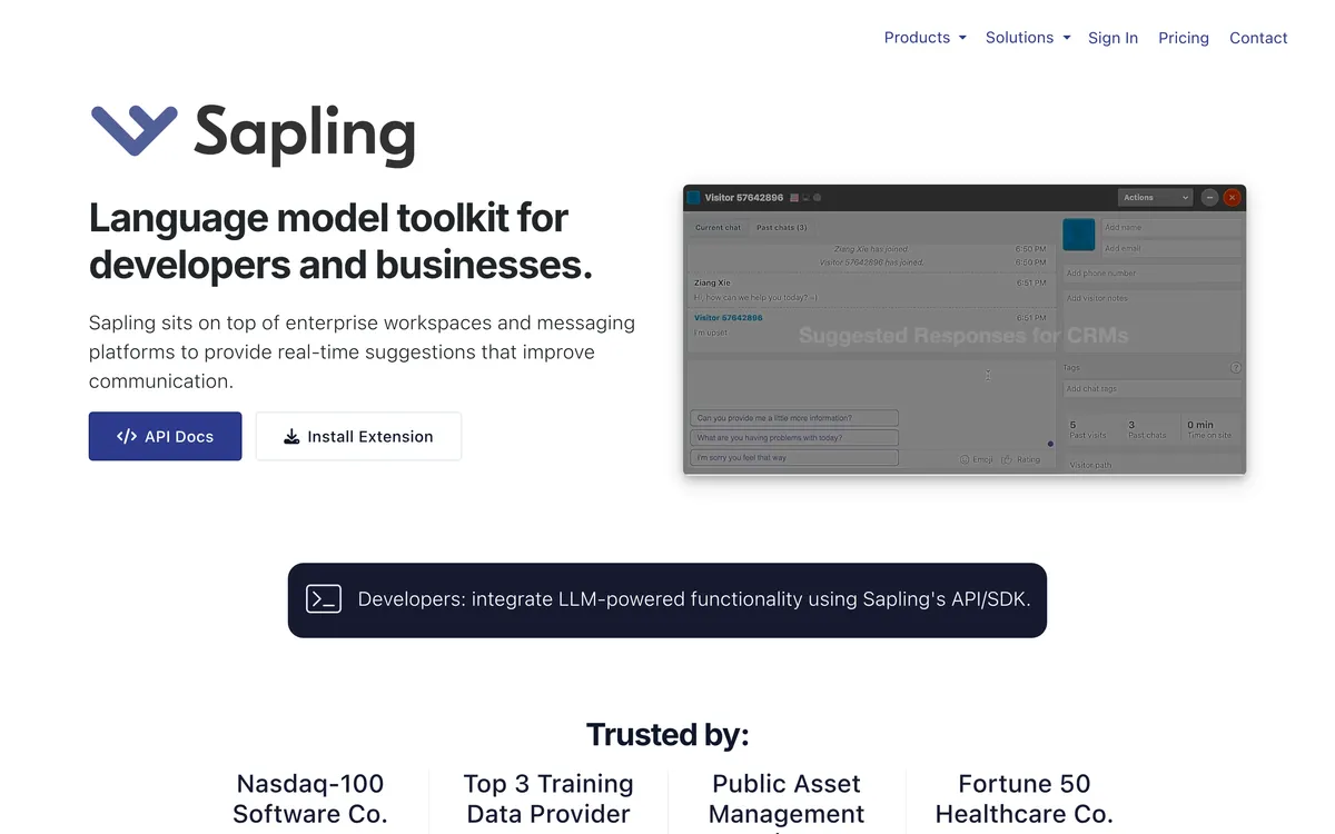 Sapling sits on top of enterprise workspaces and messaging platforms to provide real-time suggestions that improve communication. The platform offers a comprehensive API/SDK for developers to integrate LLM-powered functionality into messaging and CRM applications. It includes features such as grammar checking, autocomplete, and chat assistance, making it a versatile solution for businesses looking to enhance their customer interactions. Sapling also ensures enterprise security with TLS and AES-256 data encryption, supports single sign-on (SSO), and offers self-hosted deployment options. Its fast installation process allows developers to quickly provision and onboard their teams, making it accessible for organizations of various sizes.