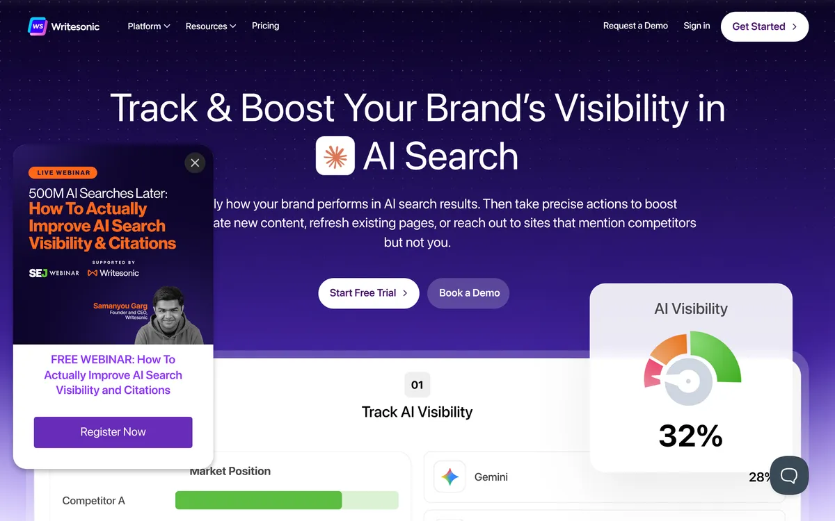 Writesonic helps track and boost brand visibility across AI search platforms.