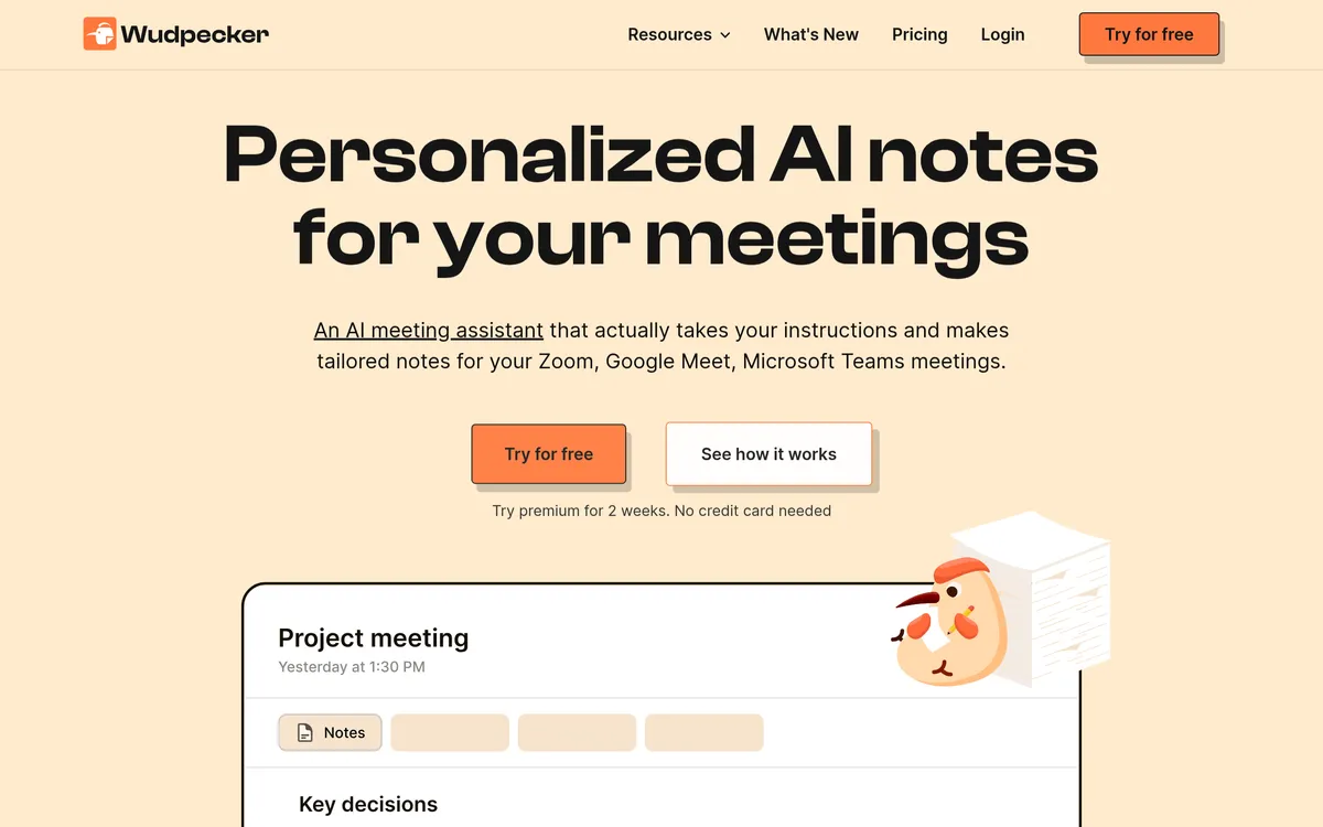 Wudpecker is an AI-driven tool designed to enhance productivity in virtual meetings. It takes user instructions to generate tailored notes for platforms such as Zoom, Google Meet, and Microsoft Teams. With this platform, users can streamline their meeting workflows, ensuring that crucial insights are captured efficiently. The service offers a free trial for new users, allowing them to experience its premium features without needing to provide credit card details. Wudpecker aims to support teams and product managers in understanding their users better by simplifying meeting documentation processes.